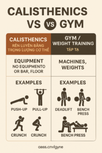 Calisthenic = liên quan đến các bài tập thể dục sử dụng trọng lượng cơ thể, không dùng máy móc.