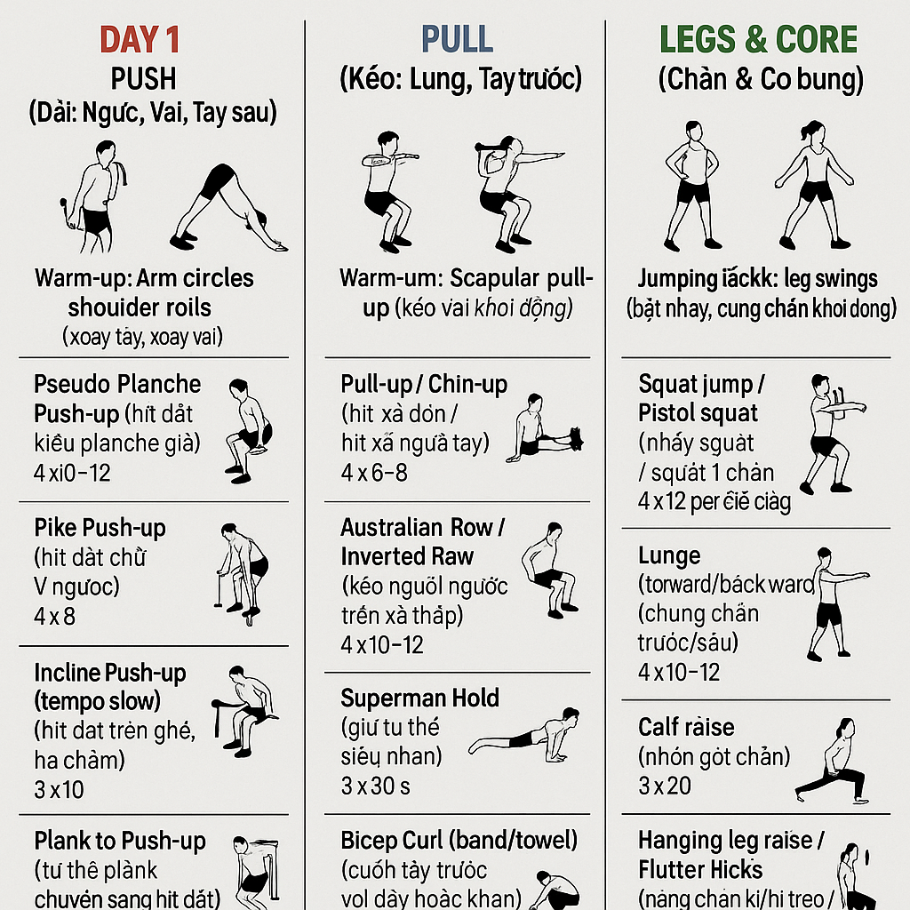 Dưới đây là lịch tập calisthenic 3 buổi 1 tuần